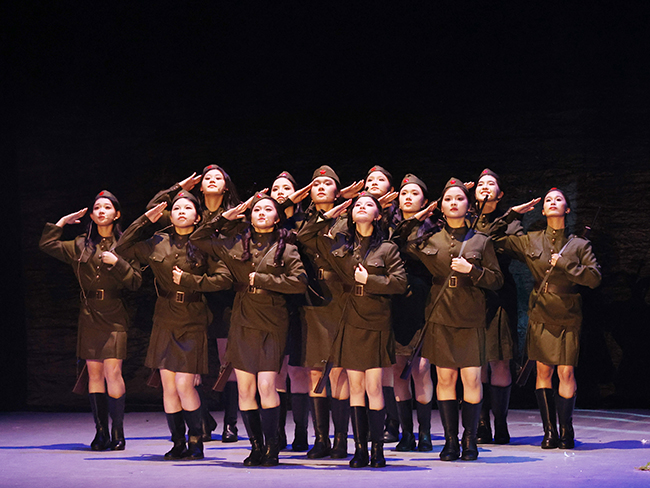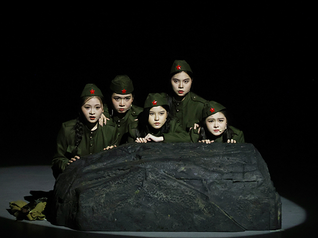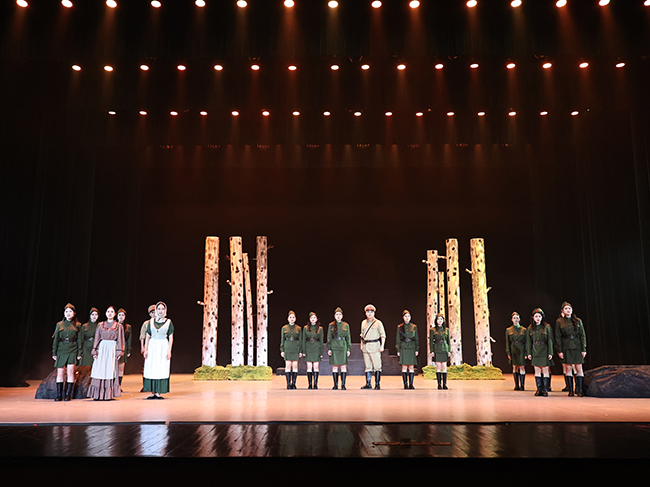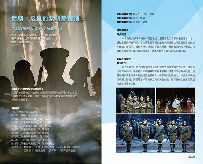 当灯光渐次亮起,戏剧影视教研室教学成果展演——话剧《这里的黎明静悄悄》拉开帷幕。该剧由戏剧影视教研室教师杜华、陆文明与在校学生共同出演,以细腻的表演、真挚的情感再现了战争年代的青春群像。作品以1942年苏联卫国战争为背景,讲述了瓦斯科夫准尉与五位女兵在保卫祖国的战斗中,面对生死抉择的悲壮故事。师生们以真情演绎人物,将课堂所学化为生动的舞台语言,从神情到步伐皆饱含力量与温度,展现了教学实践与艺术创作的深度融合。现场观众深受触动,掌声久久回荡。