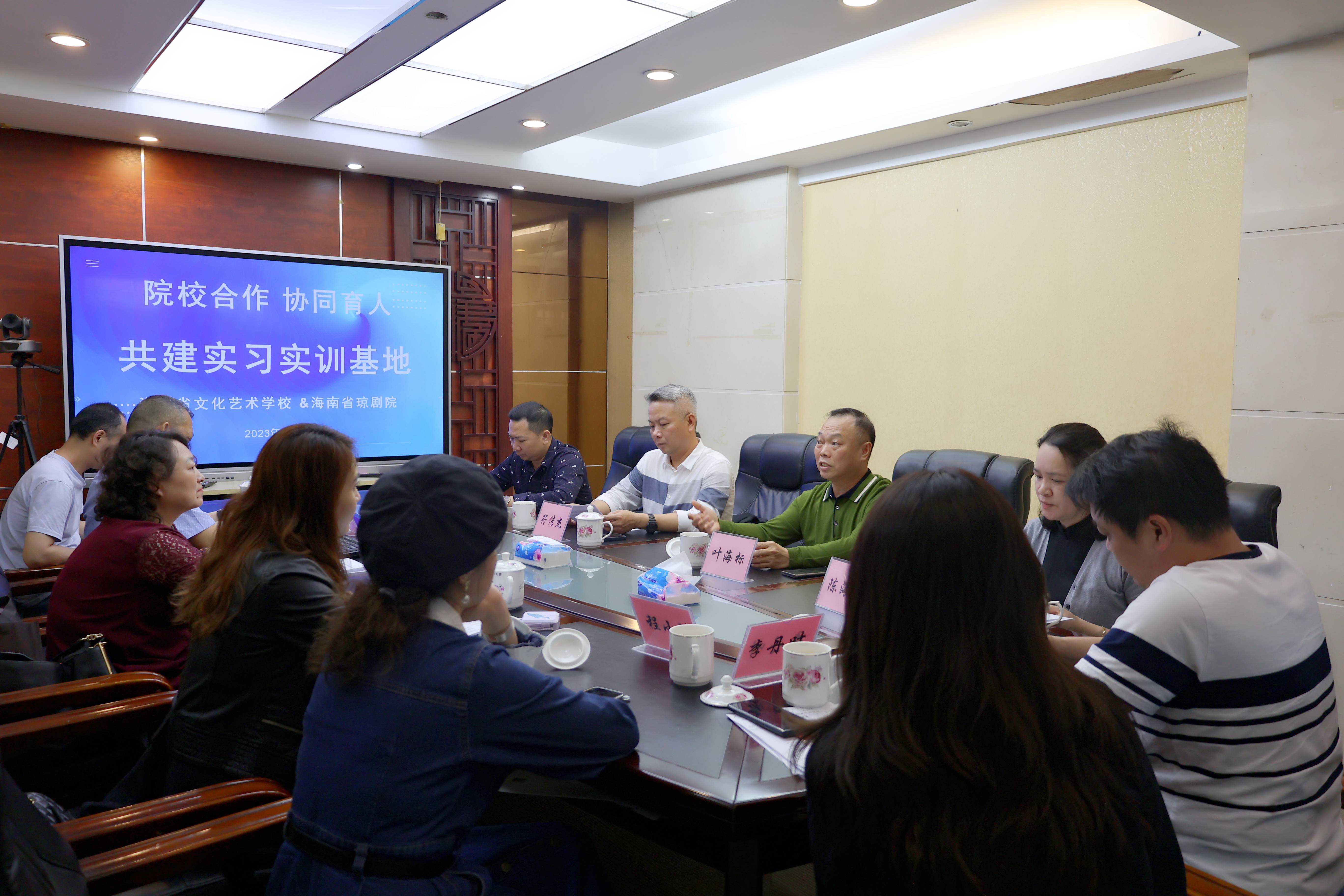 双方经过愉快的交谈,初步确定在毕业生实习、就业,学术交流、学习培训、教师进修等多方面达成全方位合作的意向,提出了许多建设性意见,并举行“海南省文化艺术学校实习实训基地”揭牌仪式。