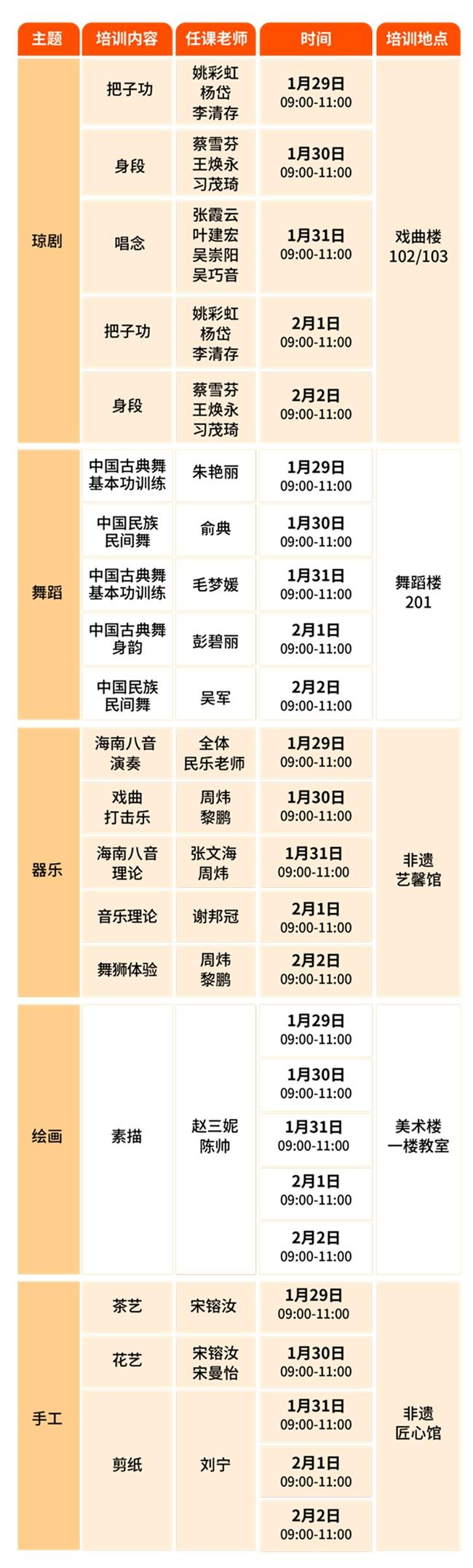 01授课内容:本次课程内容涵盖琼剧、舞蹈、器乐、绘画、手工等基础知识和技巧,将由sunbet专业教师授课。