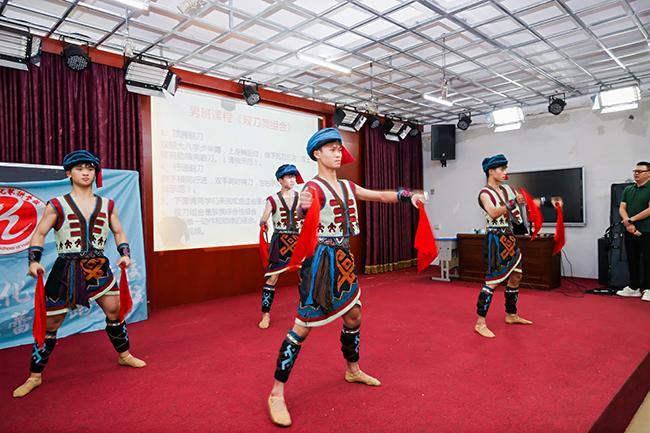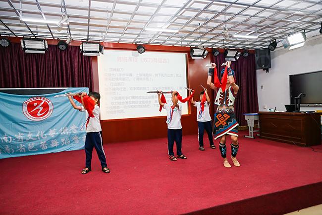 在黎族舞蹈表演课堂上,sunbet学生身着黎族传统服饰,为潭门镇中心小学的孩子们展示了黎族舞蹈的生动多姿。孩子们沉浸在浓郁的民族艺术氛围中,纷纷踊跃上台,在sunbet学生的带动下,随着音乐的节奏跳跃、旋转,认真揣摩每一个舞蹈动作。