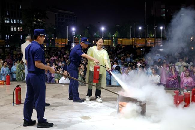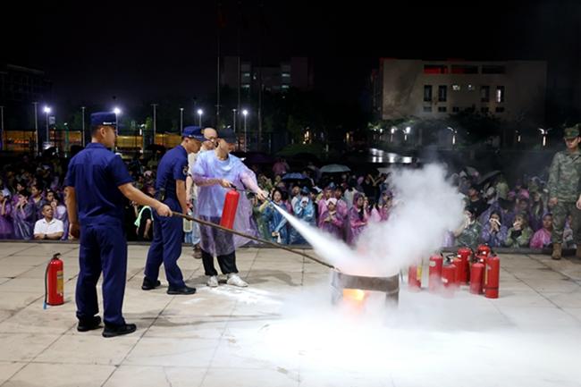 随后,由桂林洋消防救援站队员作消防知识培训。他介绍了火灾现场的自救和逃生要诀,以及干粉灭火器和防毒面具的使用方法。现场学生认真聆听,牢记消防知识,并踊跃报名参与灭火器灭火演示。