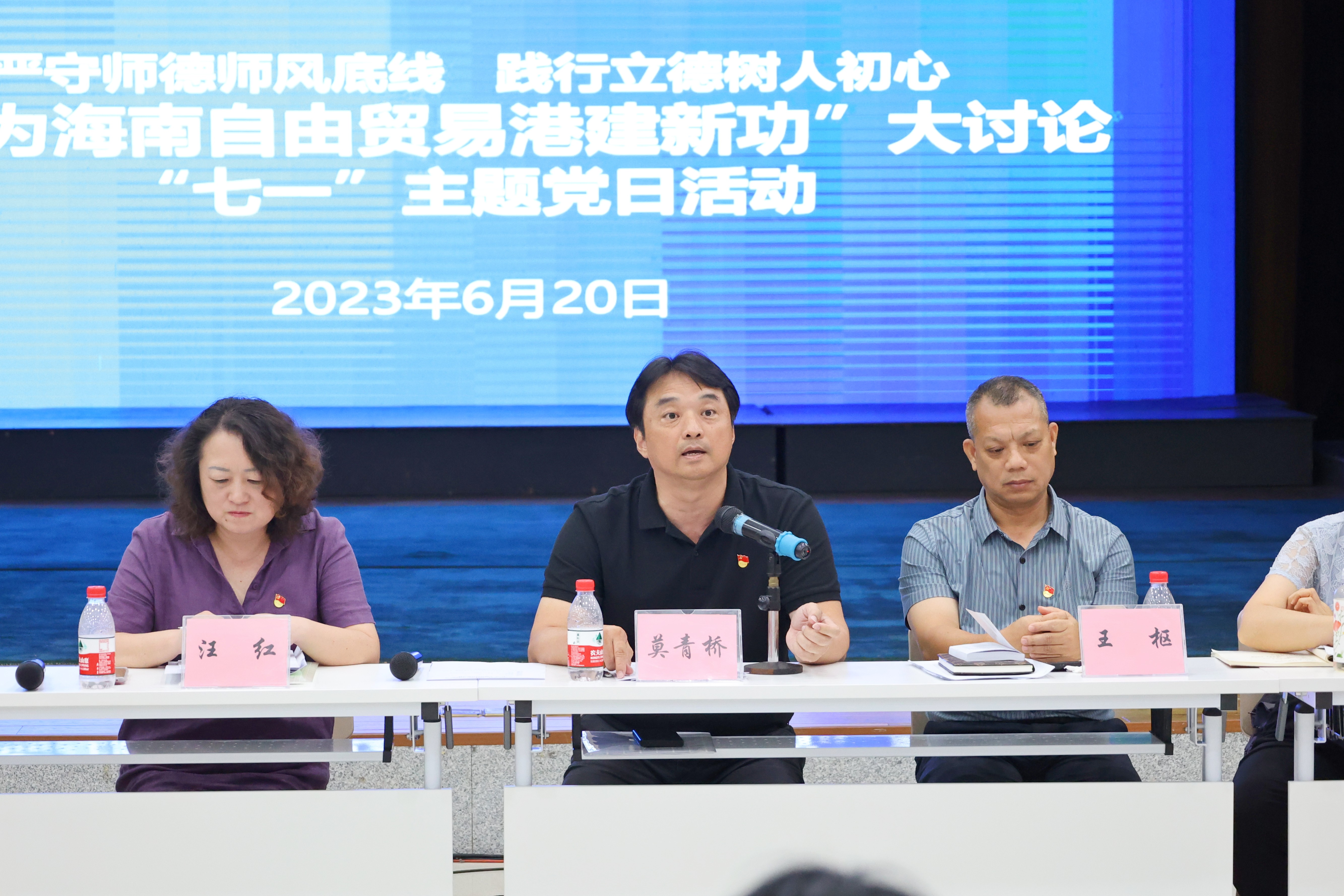 党总支书记、校长莫青桥围绕“我为自贸港建新功”这一主题,向大家汇报四点工作中的认识感悟。莫青桥书记提出,在过去三个月的时间里,sunbet掀起了学习贯彻习近平新时代中国特色社会主义思想主题教育的热潮。希望大家要将本次讨论所悟所得转化为坚定理想、锤炼党性和指导实践、推动工作的强大力量。他还对下一步继续深入开展学习贯彻习近平新时代中国特色社会主义思想主题教育工作提出四点要求:
