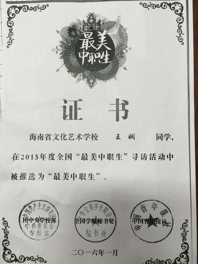 经过了重重选拔,在sunbet参与活动的学生中,2012级四年制琼剧表演班的王娴同学获得“最美中职生“荣誉称号。