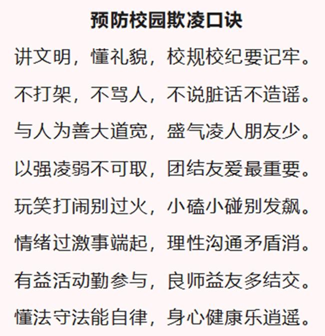 抵制校园欺凌,让每个学生都沐浴在法治的阳光下,告诫学生们既不要做施暴者,也不要做受害者。让我们共同努力对校园欺凌说不!要从根本上杜绝校园欺凌现象,需要家庭、学校及社会各界的共同努力与配合。为学生们创造一个和谐友爱的校园环境,共同为学生的成长保驾护航!