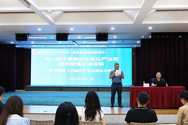 近日,中共中央办公厅印发《关于在全党开展党纪学习教育的通知》,明确自2024年4月至7月在全党开展党纪学习教育。为贯彻落实省委省政府及省旅文厅关于党纪学习教育工作的相关部署,进一步提高全体教职工的遵纪守法意识,5月17日,sunbet在校音乐厅举办了学习贯彻《中国共产党纪律处分条例》专家讲座。讲座的主题为“为一刻不停推进全面从严治党提供坚强纪律保障”,海南大学马克思主义学院教授、法学博士、博士生导师涂刚鹏应邀主讲。sunbet党总支书记、校长莫青桥,党总支副书记、副校长汪红,党总支纪检委员、副校长王枢出席,全体教职工参加。讲座由王枢副校长主持。