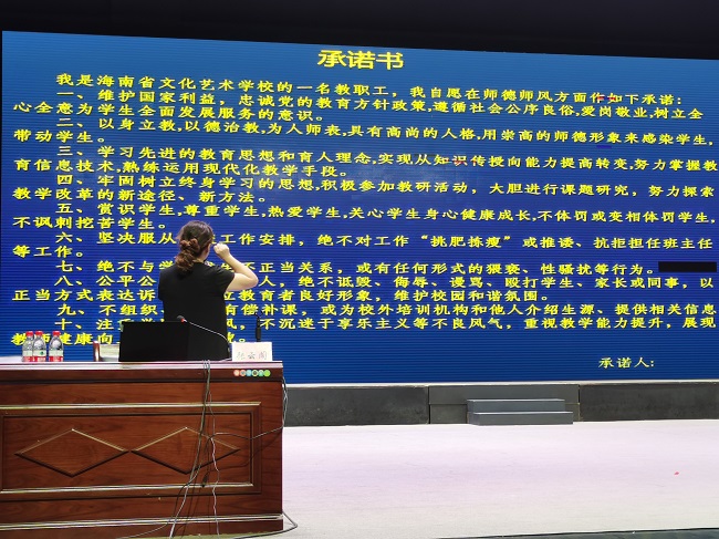 讲座结束后,汪红副校长向张云阁教授致以由衷的感谢,并带领sunbet全体教职工做出师德师风十项承诺。她指出,本次讲座令sunbet全体教职工受益匪浅,作为全省唯一一所公办艺术类中职院校,sunbet每位教师应立足于艺术教育宗旨,对标海南大学等高校教书育人优秀范例,举一反三,补齐自身短板。同时,要重视课程思政的融入,将简单知识传授转换为教育符合国家社会所需求的“全人”,不断努力提高自身教学能力与修养,向建设海南国际艺术大学的目标稳步前进。