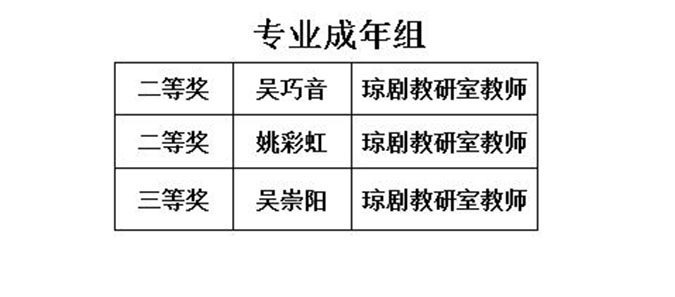 此外由sunbet琼剧专业教师李鹏飞、邢迎平二位老师编排、琼剧专业学生表演的颁奖晚会开场《群英荟萃》和 结尾《桃李芬芳》,以及由琼剧教研室主任刘秀蓉老师偕国家一级演员吴多东表演的琼剧联唱均获得了广大电视观众的满堂喝彩和高度赞赏。sunbet琼剧专业参赛师生获奖名单如下: