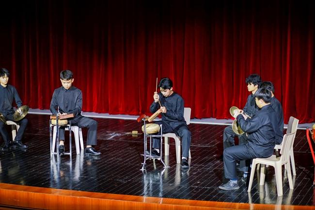 本次演出主题为“盛世中华 砥砺奋进”,以一曲民族管弦乐合奏《我的祖国》拉开序幕,铿锵有力的演奏迅速调动起了现场观众的情绪。活动中,演奏人员通过演奏打击乐合奏《动鼓情》、笛子独奏《牧民新歌》、钢琴独奏《皮黄》、二胡独奏《翻身歌》、大提琴独奏《巴赫第一首》、笙独奏《秦王破阵乐》等多种乐器表演形式,使乐曲在实训剧场久久响彻,将现场气氛推向了高潮。台上的演奏者们以高超的演奏技巧、默契的配合,以及对作品的完美诠释,让现场观众感受到器乐演奏的艺术魅力。